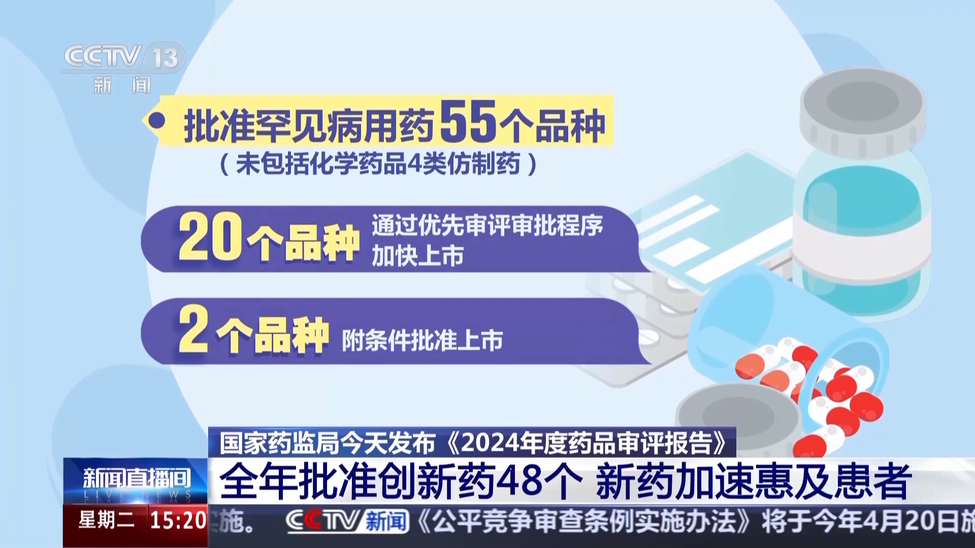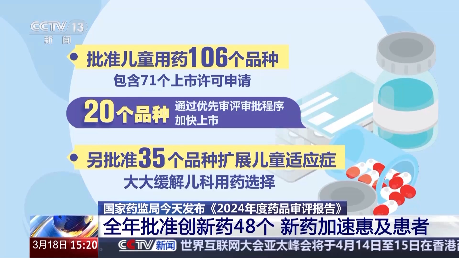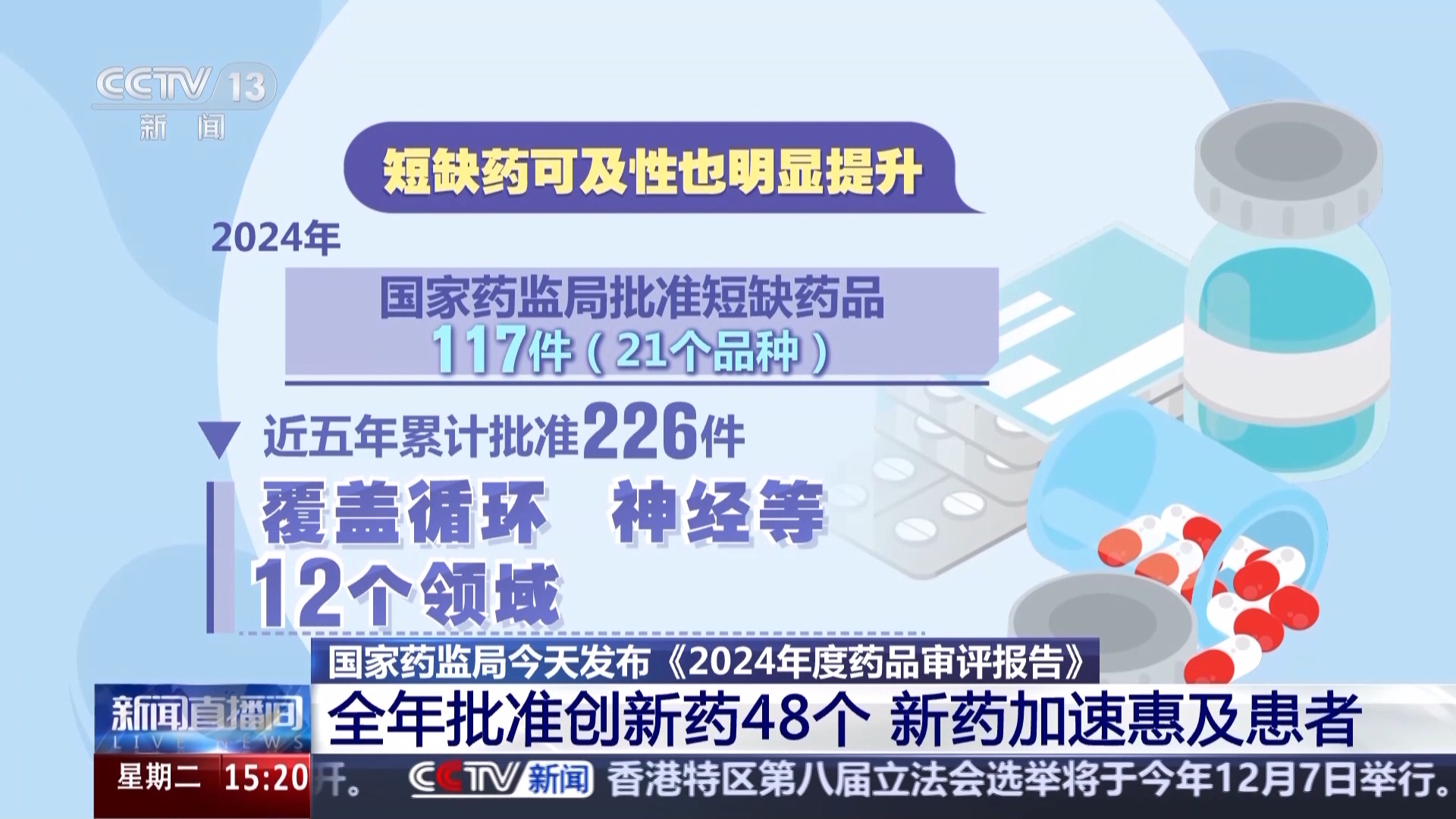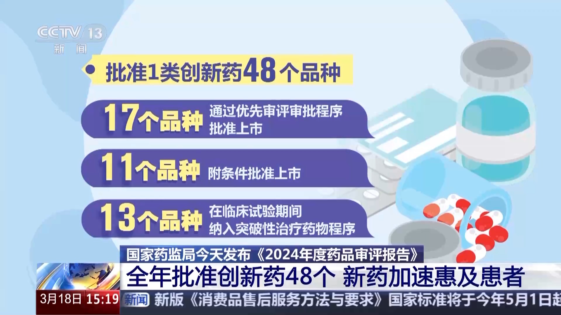国家药监局今天发布《2024年度药品审评报告》。报告显示,2024年我国全年批准1类创新药48个,涵盖肿瘤、神经系统疾病、内分泌系统疾病和抗感染等近20个治疗领域,一大批新药好药加速惠及患者。