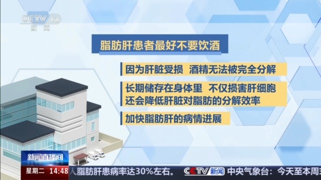 脂肪肝患者最好不要饮酒,因为肝脏受损,酒精无法被完全分解,长期储存在身体里,不仅损害肝细胞,还会降低肝脏对脂肪的分解效率,加快脂肪肝的病情进展。