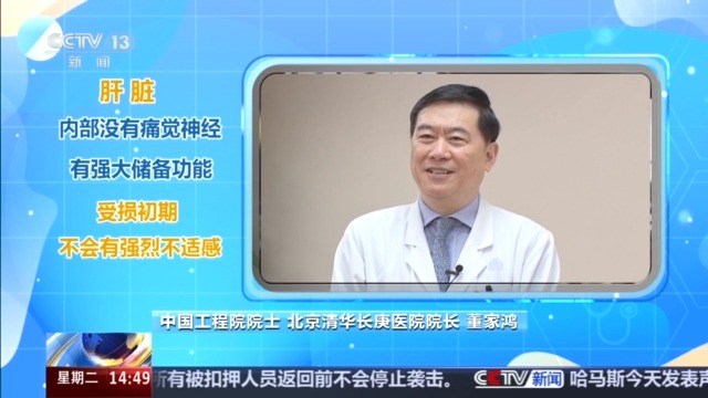 中国工程院院士 北京清华长庚医院院长 董家鸿:需要提醒的是肝脏不同于其他器官,因为肝脏内部没有痛觉神经,而且肝脏有强大的储备功能,所以在受损的初期不会有强烈不适感而引起患者的重视。而当人们察觉到异常的时候,往往肝脏已经受到了严重损害,病情已经发展到了中后期。