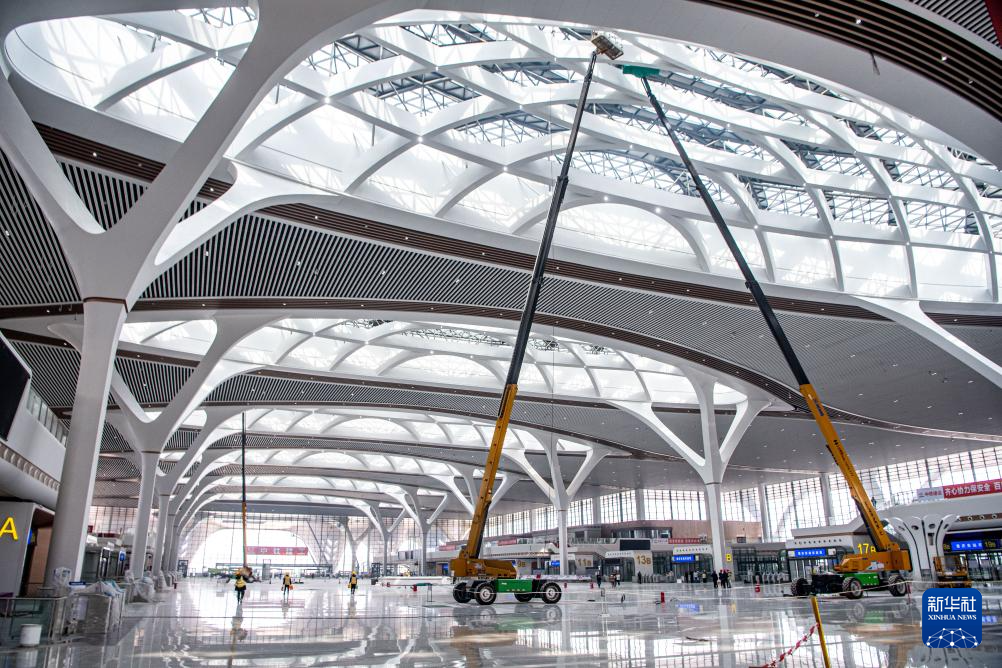 这是3月19日拍摄的重庆东站候车大厅,建设工人在进行完工后的收尾工作。新华社记者 唐奕 摄