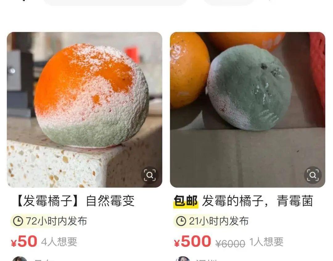 在某知名二手交易平台上,多个卖家挂出了发霉橘子的商品链接,价格从几十元到上百元不等。这些橘子图片显示,表面布满了绿毛和黑斑,明显已经变质。有的标注 “自然霉变”,售价50元,吸引了4人表示想要;还有标有 “青霉菌” 的发霉橘子,原价6000元,现价500元,也有1人有意购买。部分卖家在商品描述中宣称发霉橘子可用于生物、化学实验,有的商品直接描述为“适合做实验用”。