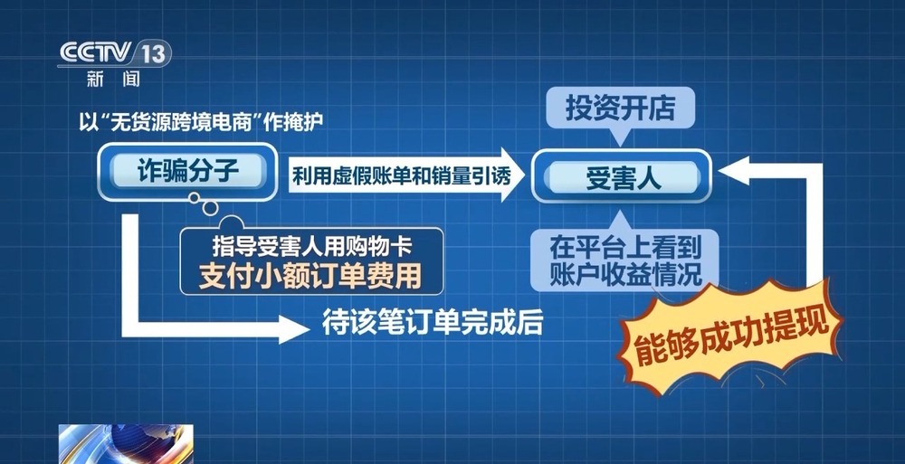 警方介绍,诈骗分子以“无货源跨境电商”作掩护,利用虚假账单和销量引诱他人投资开店,再指导受害人用购物卡支付小额订单费用,待该笔订单完成后,受害人在平台上会看到账户收益情况而且能够成功提现。当受害人放下戒心,投入更多资金后,骗子就会以“未按时完成订单”“客户投诉”等各种理由限制提现,甚至冻结账户资金。