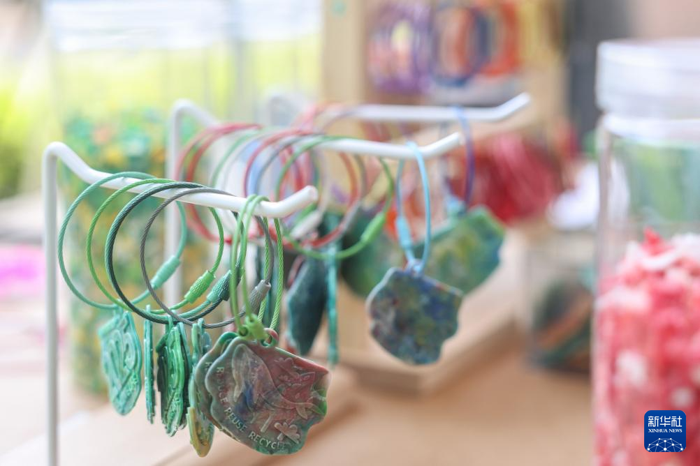 这是3月25日在博鳌亚洲论坛零碳休息区展示的使用废弃塑料制作的钥匙扣。