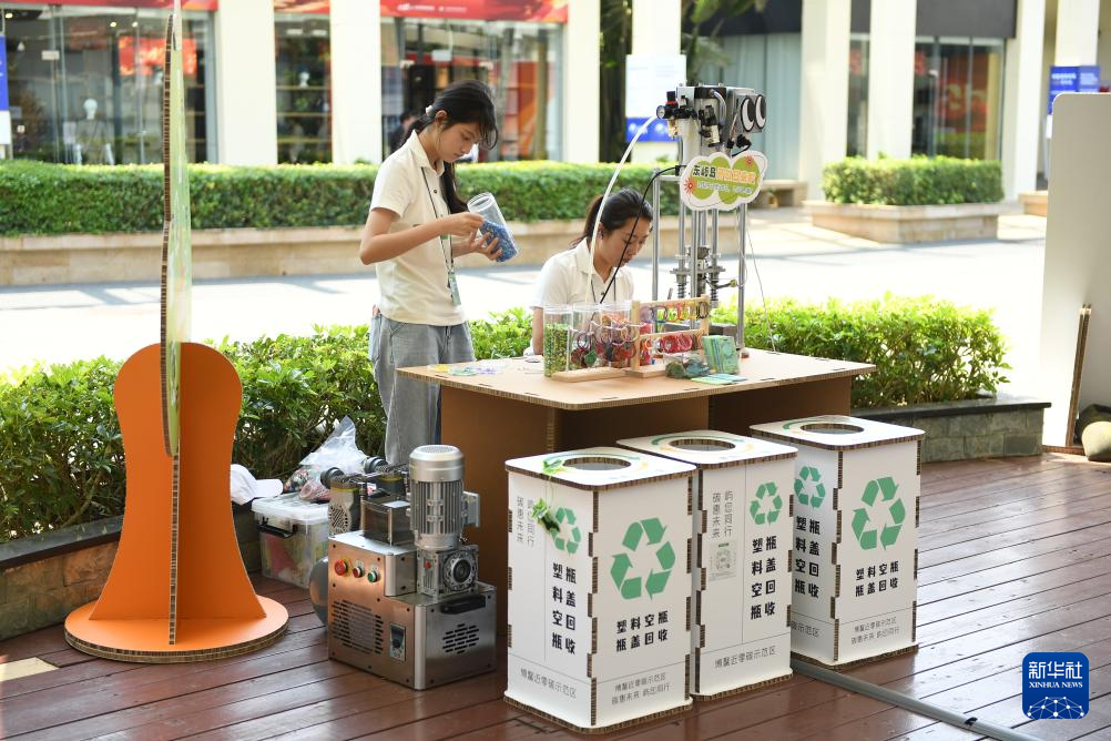 这是在博鳌零碳示范区内的塑料再生流程科普展台上,工作人员演示塑料再生流程(3月25日摄)。