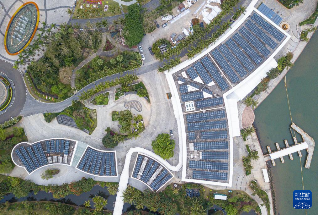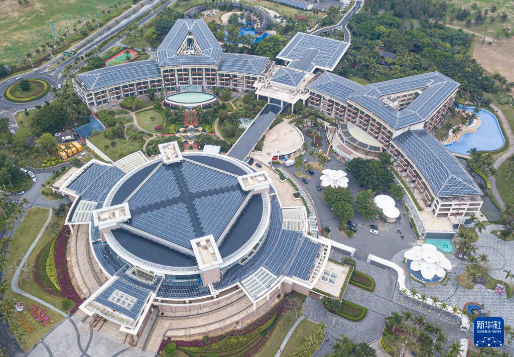 这是在博鳌零碳示范区拍摄的博鳌亚洲论坛新闻中心及配楼屋顶的光伏设备(无人机照片,3月16日摄)。