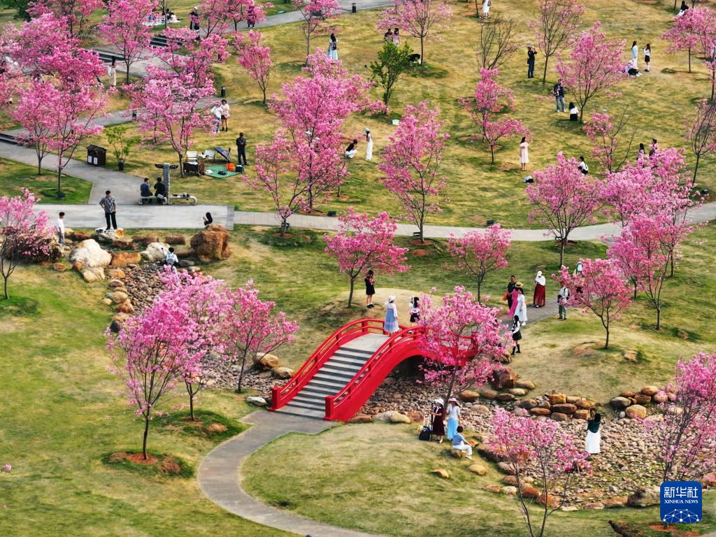 3月25日,人们在广西南宁市青秀山风景区观赏樱花(无人机照片)。