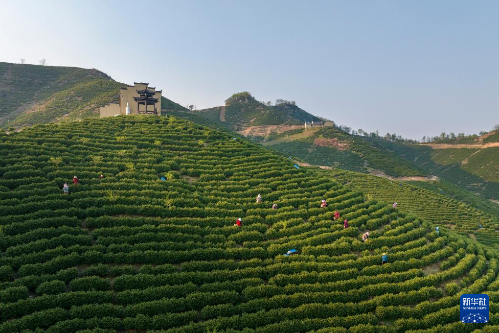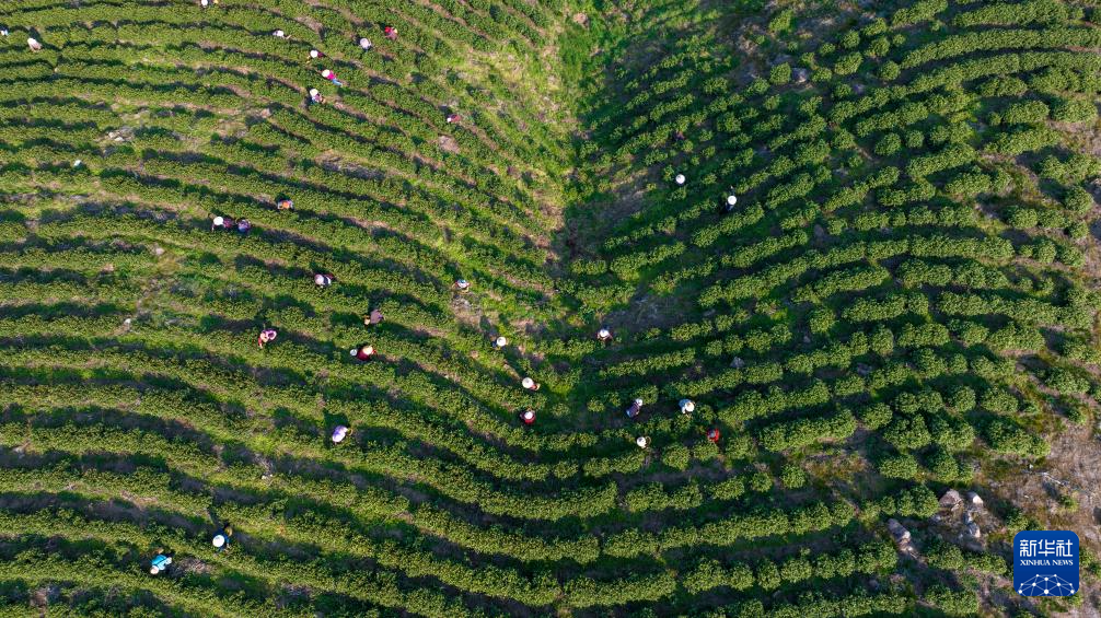 3月26日,茶农在安徽省黄山市徽州区潜口镇坤沙村采摘黄山毛峰鲜叶(无人机照片) 。