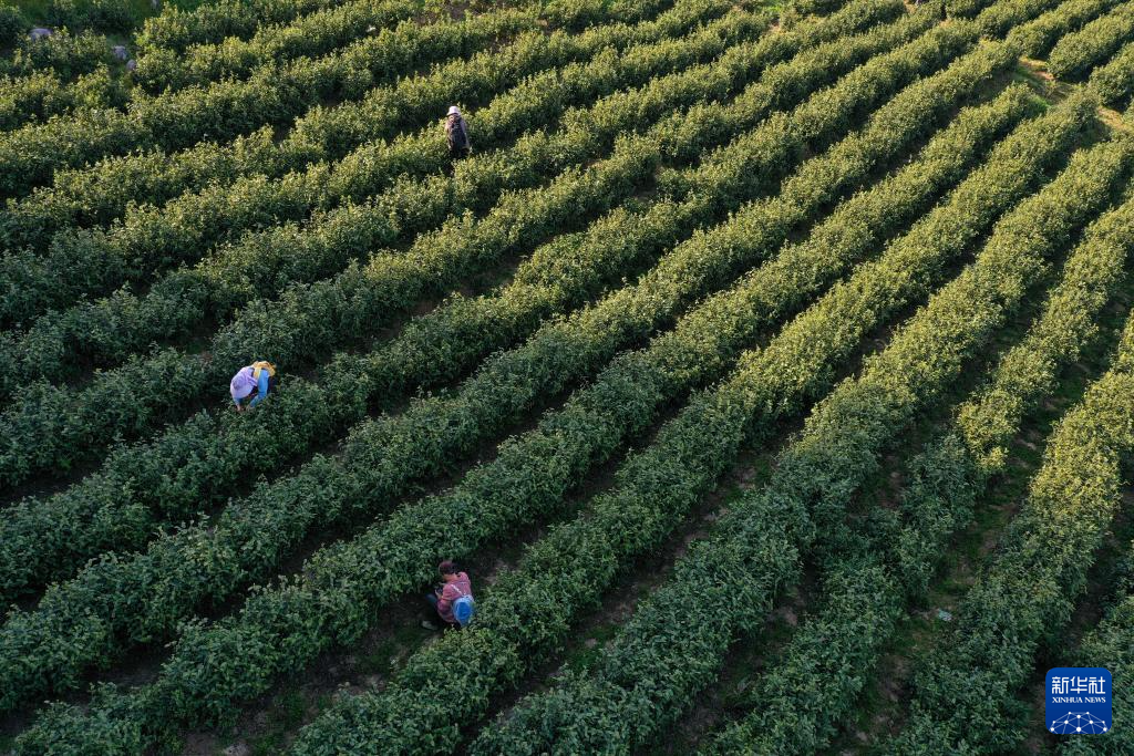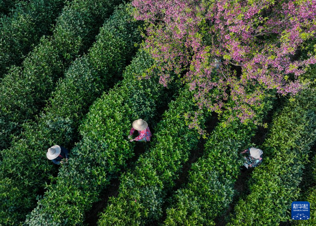 3月26日,茶农在贵州省遵义市正安县瑞溪镇桂花园茶园采茶(无人机照片)。