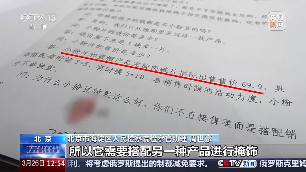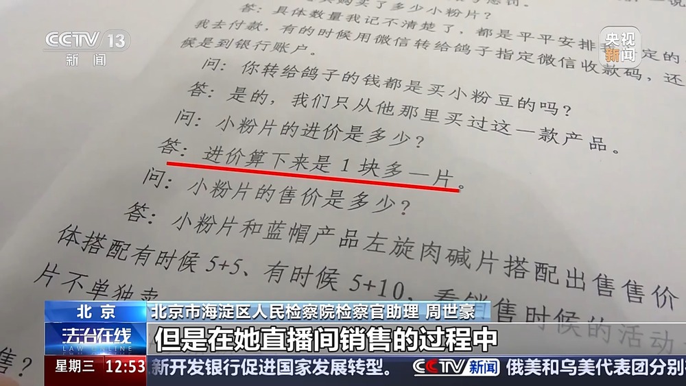 北京市海淀区人民检察院检察官助理 周世豪:因为我们在她的聊天记录中发现,她进货的价格其实只是一元一片,但是在她直播间销售的过程中,这个小粉豆会搭配另一种减肥产品进行一同销售,一共是10粒,大约可以售卖到69块9左右。