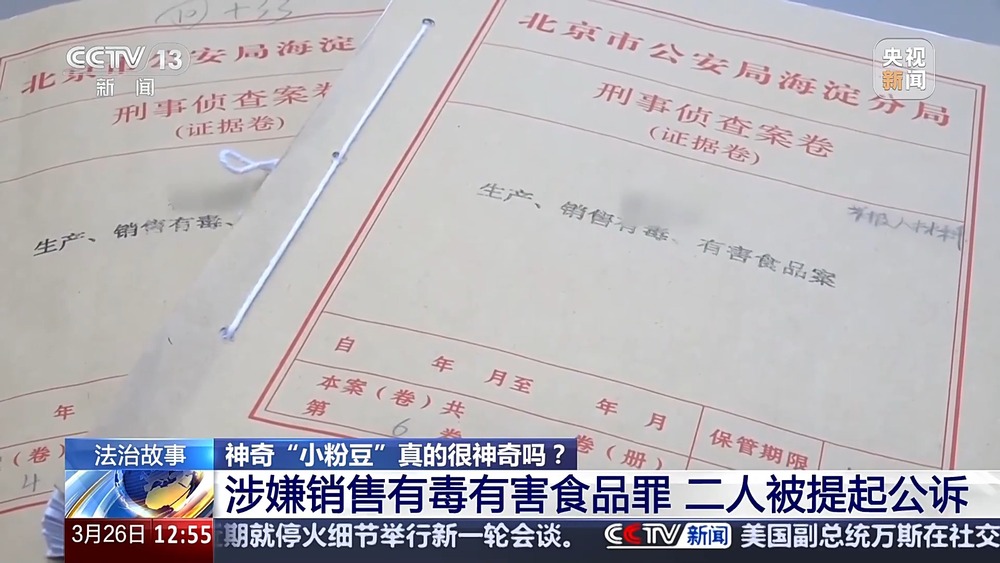 北京市海淀区人民检察院检察官助理 周世豪:然而小粉豆这种产品其实由于自己本身并没有蓝帽资质,所以它需要搭配另一种产品进行演示,对监管平台进行一种迷惑。从我们现在掌握的证据来看,他们总共的售卖时间大约是在四五个月期间,分批次进货,第一次是进了10万粒左右,第二次是进了100万粒左右,所进的货整体就已经销售了。