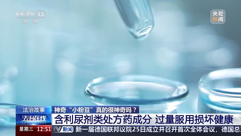北京市海淀区人民检察院检察官助理 周世豪:如果过度使用的话极容易导致过敏反应或者是低钾血症、高糖血症和其他的疾病出现,小粉豆,经过检测,我们发现它其实是一种普通物质,加上苄氟噻嗪这种利尿剂的物质,它最主要的实现功效就是苄氟噻嗪在其中发挥的这种利尿,使人体多排水,从而达到一种表面上体重减轻的效果。