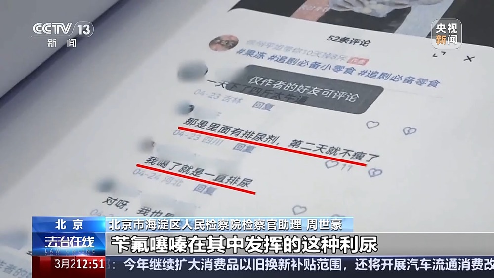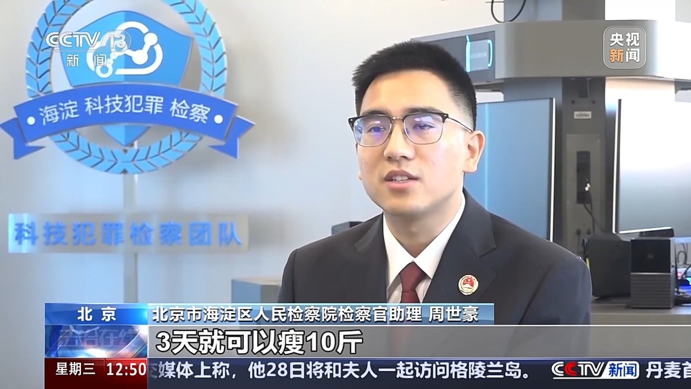 北京市海淀区人民检察院检察官助理 周世豪:她宣传的就是很让人惊讶的那种减肥言论,比如说一天瘦3斤,3天就可以瘦10斤,早上吃晚上就能掉秤,没有危害,没有副作用。