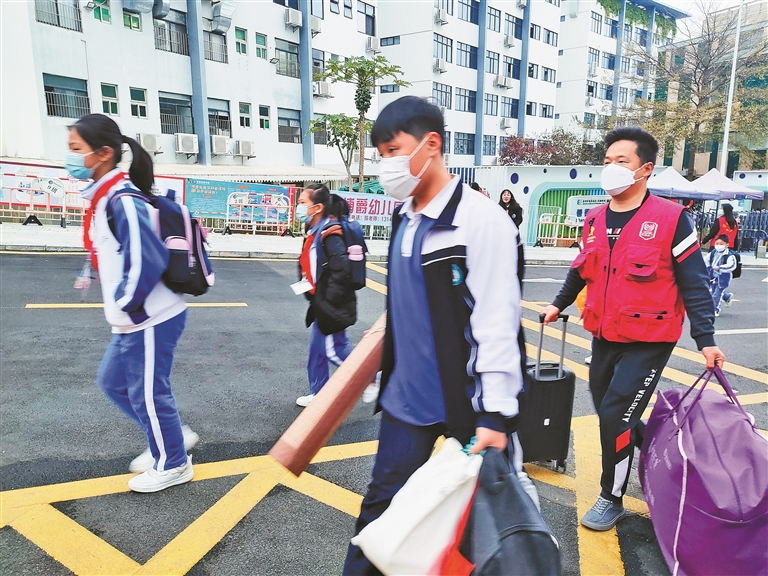 汪勇刚(红马甲)组织退役军人帮助同学搬运行李。