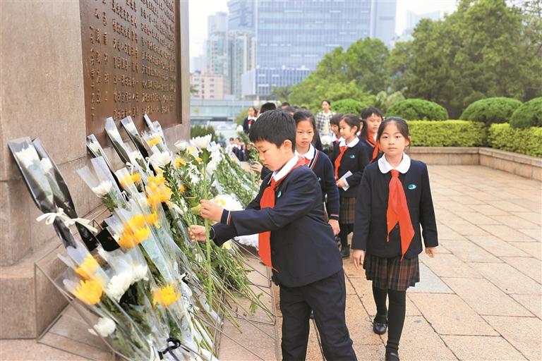 ▲3月31日,师生代表到深圳革命烈士陵园敬献鲜花。深圳晚报记者 陈玉 摄