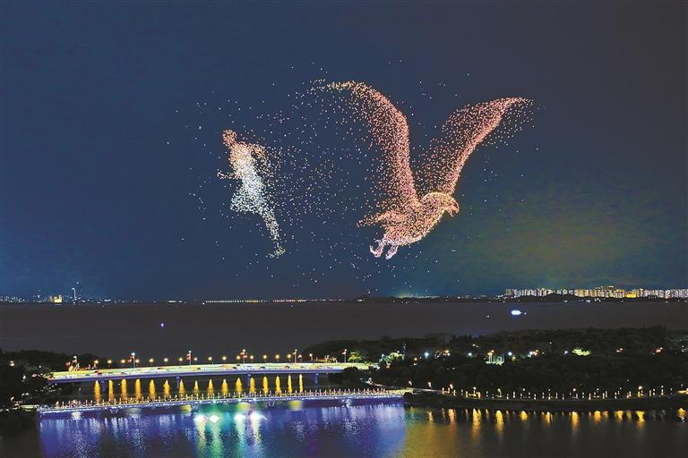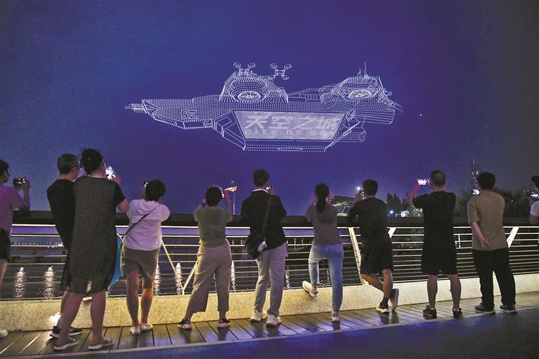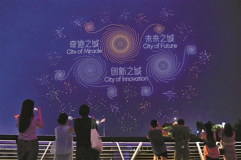 市民、游客在深圳湾观看大漠大智控呈现的无人机编队表演。