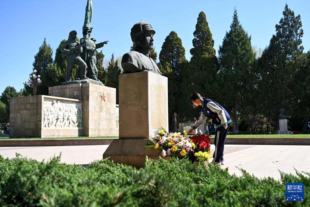4月1日,在位于石家庄市的华北军区烈士陵园,一名学生向烈士塑像献花。