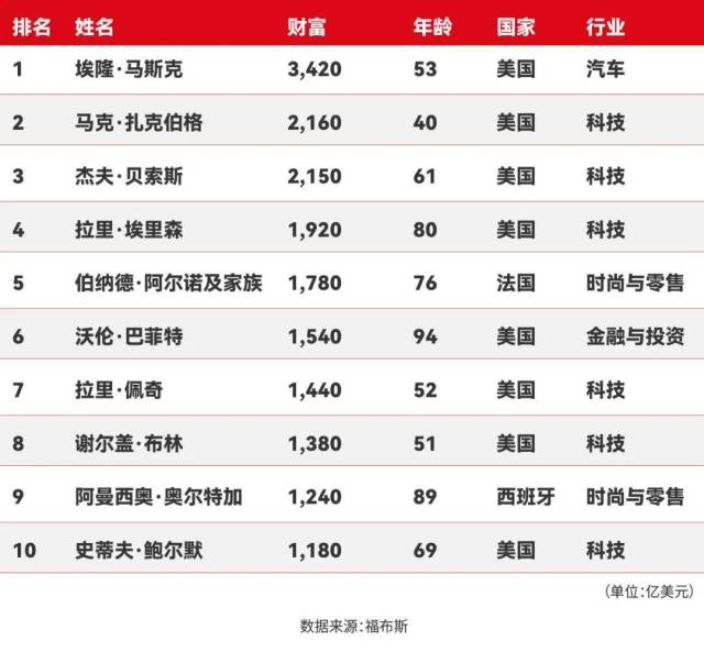 榜单显示,埃隆·马斯克身家达3420亿美元,排名第一;马克·扎克伯格(2160亿美元)排名第二,这也是他首次排名第二;亚马逊的杰夫·贝索斯(2150亿美元)位列第三;甲骨文的拉里·埃里森(1920亿美元)排在第四;阿尔诺(1780亿美元)因旗下奢侈品集团LVMH股价下跌,跌至第五位,这是他自2017年以来的最低排名。