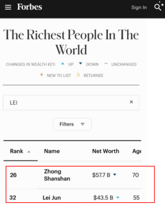 记者检索发现,在榜单中钟睒睒以577亿美元身价排名第26位,雷军以435亿美元身价排名第32位。