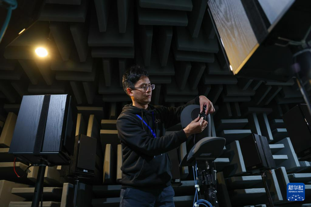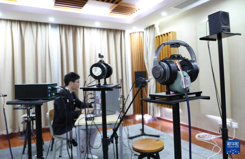 4月2日,在冠旭电子深圳总部的实验室,员工为耳机产品做测试。