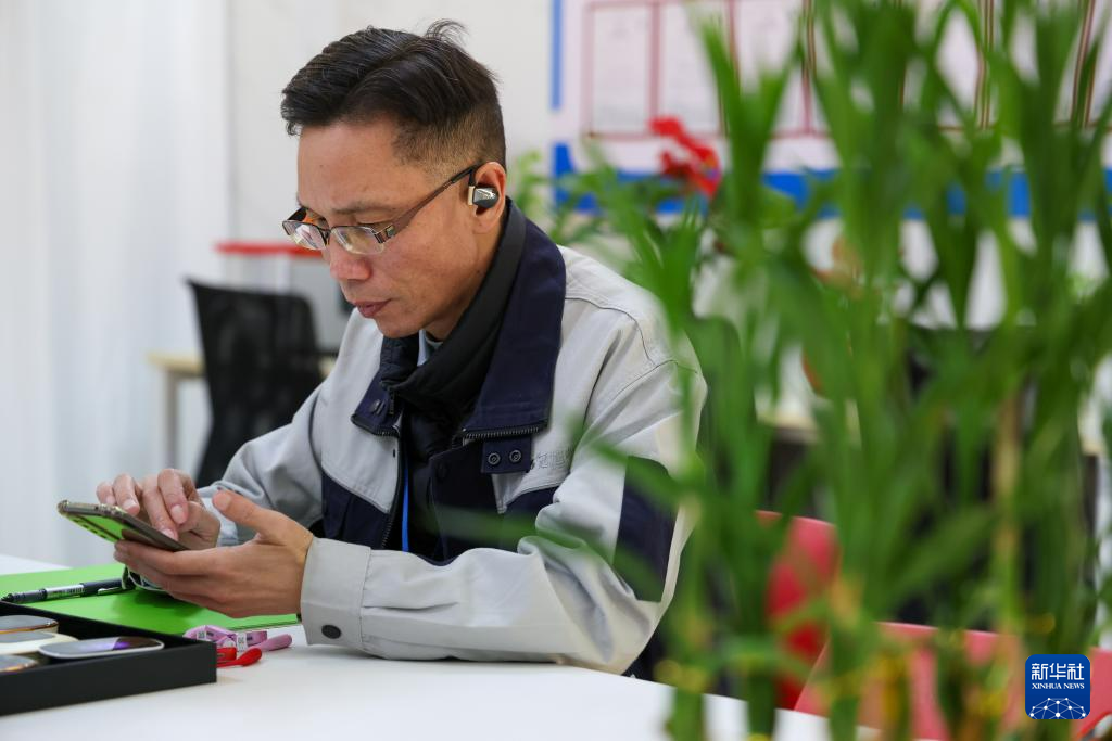 4月2日,在冠旭电子深圳总部,全国劳动模范、全国五一劳动奖章获得者、冠旭电子研发总监彭久高为耳机产品做测试。