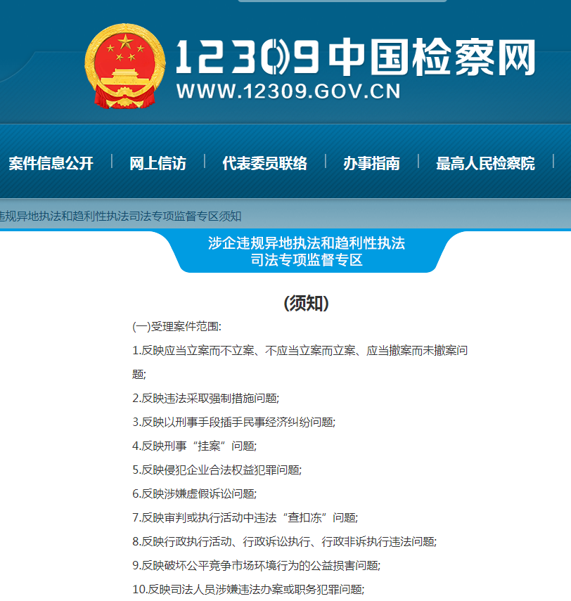 记者4月8日从最高人民检察院获悉,为畅通诉求表达渠道,依法平等保护各类经营主体合法权益,最高检在12309中国检察网设立了“涉企违规异地执法和趋利性执法司法专项监督专区”,受理有关控告线索。