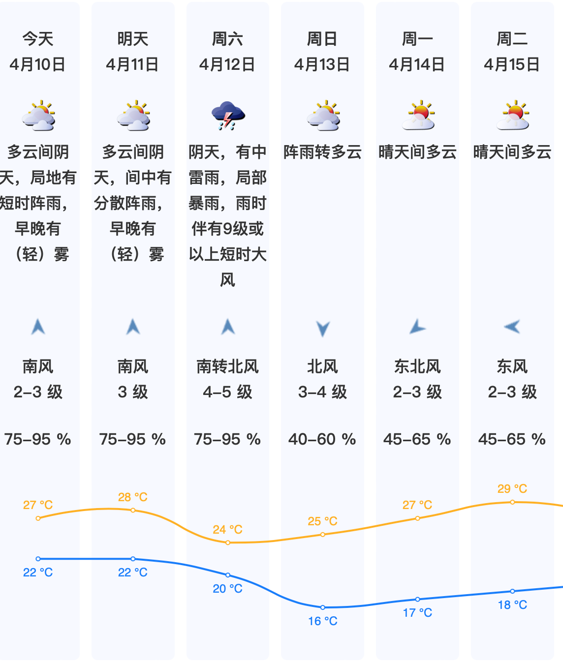 4月10日,深圳多云间阴天,局地有短时阵雨,早晚有(轻)雾;气温22-27℃;南风2-3级;相对湿度75%-95%。
