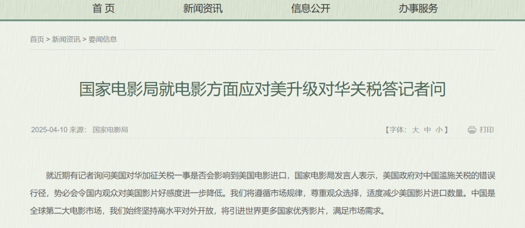 就近期有记者询问美国对华加征关税一事是否会影响到美国电影进口,国家电影局发言人表示,美国政府对中国滥施关税的错误行径,势必会令国内观众对美国影片好感度进一步降低。我们将遵循市场规律,尊重观众选择,适度减少美国影片进口数量。中国是全球第二大电影市场,我们始终坚持高水平对外开放,将引进世界更多国家优秀影片,满足市场需求。