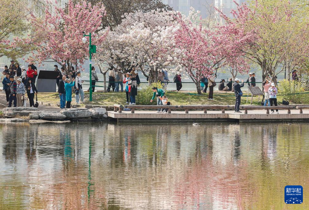 4月10日,游客们在北京玉渊潭公园游览拍摄。
