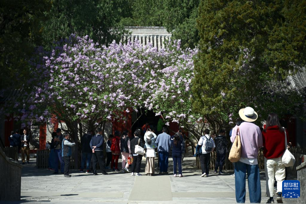 4月6日,游客在北京大觉寺拍摄盛开的鲜花。
