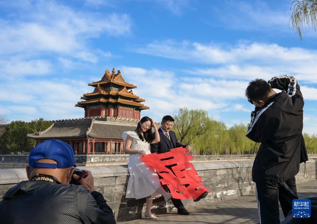 3月25日,一对情侣在北京故宫角楼处拍摄新婚照片,吸引几位摄影爱好者纷纷举起相机记录下春日里的浪漫一刻。