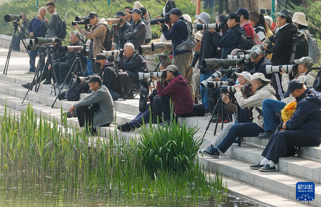 4月10日,摄影爱好者在北京玉渊潭公园架起“长枪大炮”拍摄湖面鸟禽。