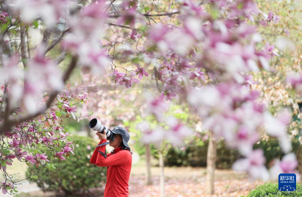 4月8日,在北京市海淀区一处街边花园,一位摄影爱好者在拍摄玉兰花。