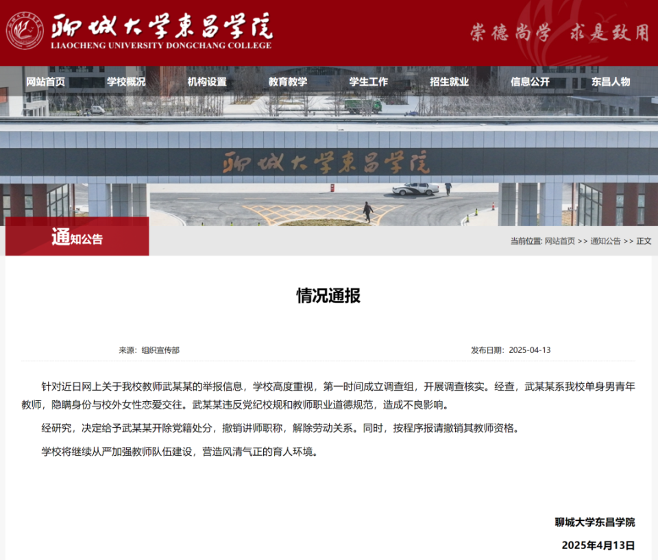 4月13日,山东聊城大学东昌学院官网发布情况通报: