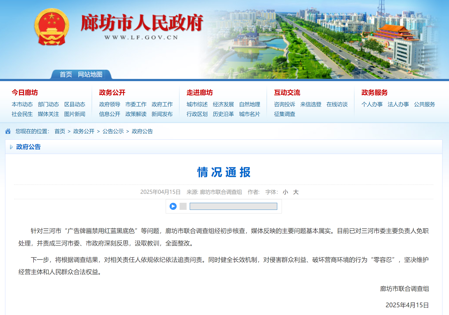 央视网消息:据廊坊市人民政府网站消息,廊坊市联合调查组发布情况通报。针对三河市“广告牌匾禁用红蓝黑底色”等问题,廊坊市联合调查组经初步核查,媒体反映的主要问题基本属实。目前已对三河市委主要负责人免职处理,并责成三河市委、市政府深刻反思,汲取教训,全面整改。