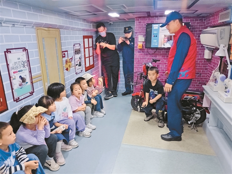 上芬社区儿童在消防宣传大篷车内学习消防安全知识。