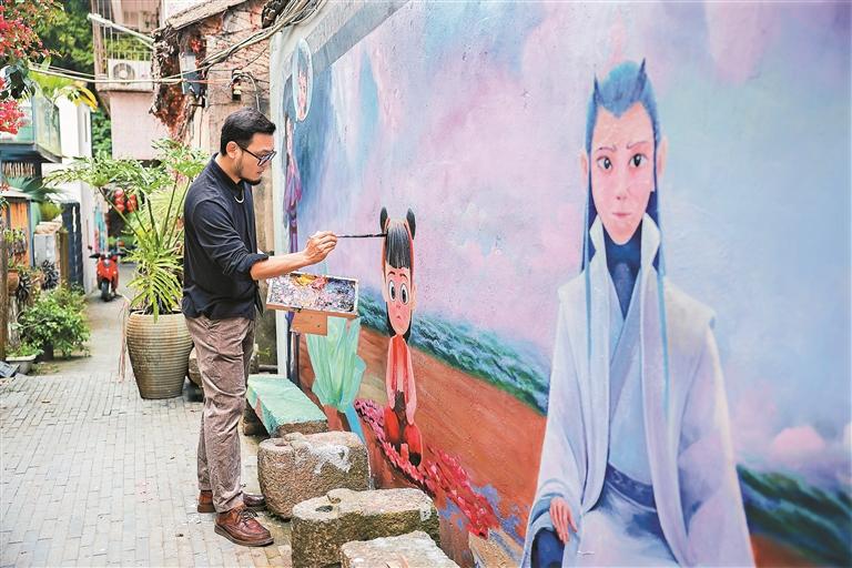 上围艺术村人觉社工作室创始人陈传沛和团队创作哪吒主题墙绘。
