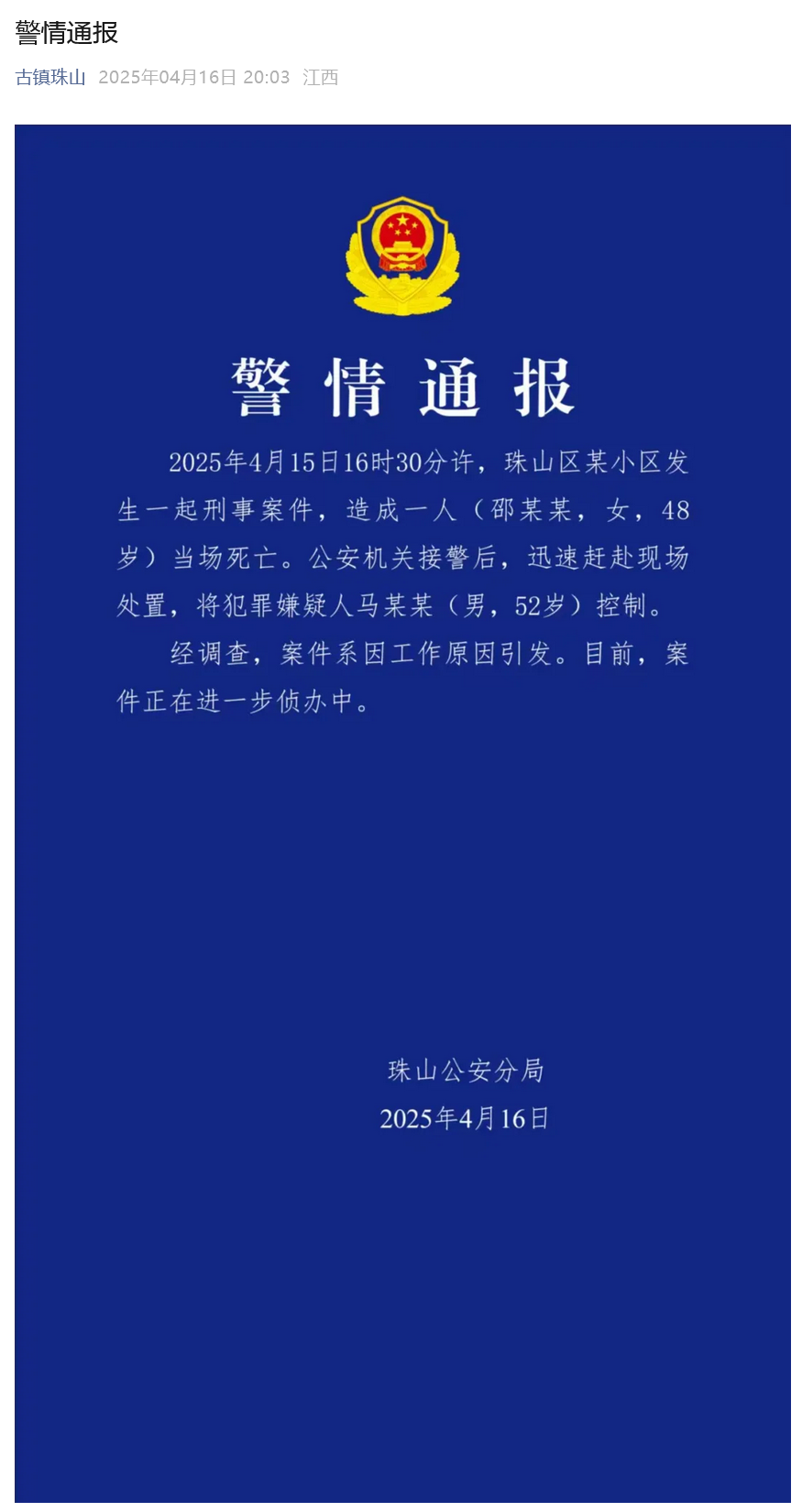 4月16日,据江西省景德镇市珠山区融媒体中心消息,珠山公安分局发布警情通报: