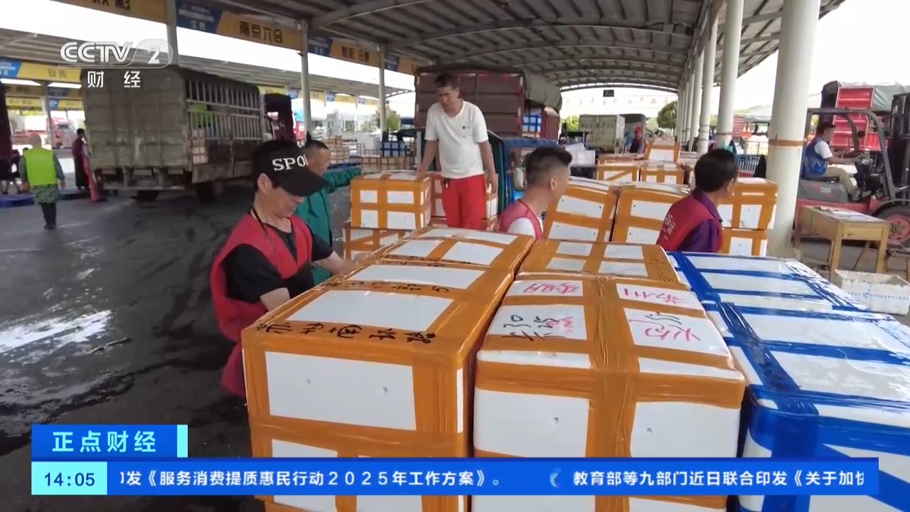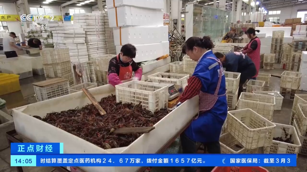 而在湖北潜江小龙虾交易中心内,也是一派繁忙景象。一箱箱鲜活的小龙虾正在被快速打包装卸,吸引了全国各地的客商前来抢购。