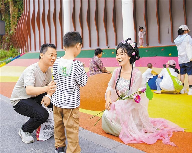碧道现场设置了互动体验区,在“花神巡游区”,钗鬟摇曳的花神们在碧道演绎节气短剧,与市民行古礼互动,以“诗句接龙赠花笺”“时令习俗问”等趣味形式传播节气文化。此外,区妇联与深圳图书馆联动呈现的二十四节气主题展也十分吸睛。