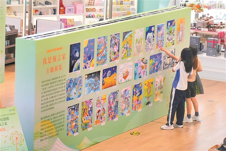 “未来公民创想·我是预言家”主题绘画作品展在深圳书城中心城北区美学生活馆光之塔同步开展。近百幅由全市青少年精心创作的绘画作品,在木制展架上依次排列,画面中,孩子们想象中的悬浮滑板和空中巴士穿梭于高楼大厦之间。机器人、火箭、电脑、AI等元素层出不穷,深圳少年关于未来深圳、未来科技的奇思妙想,令人叹为观止,每一幅都承载着年轻心灵的无限创意与想象。