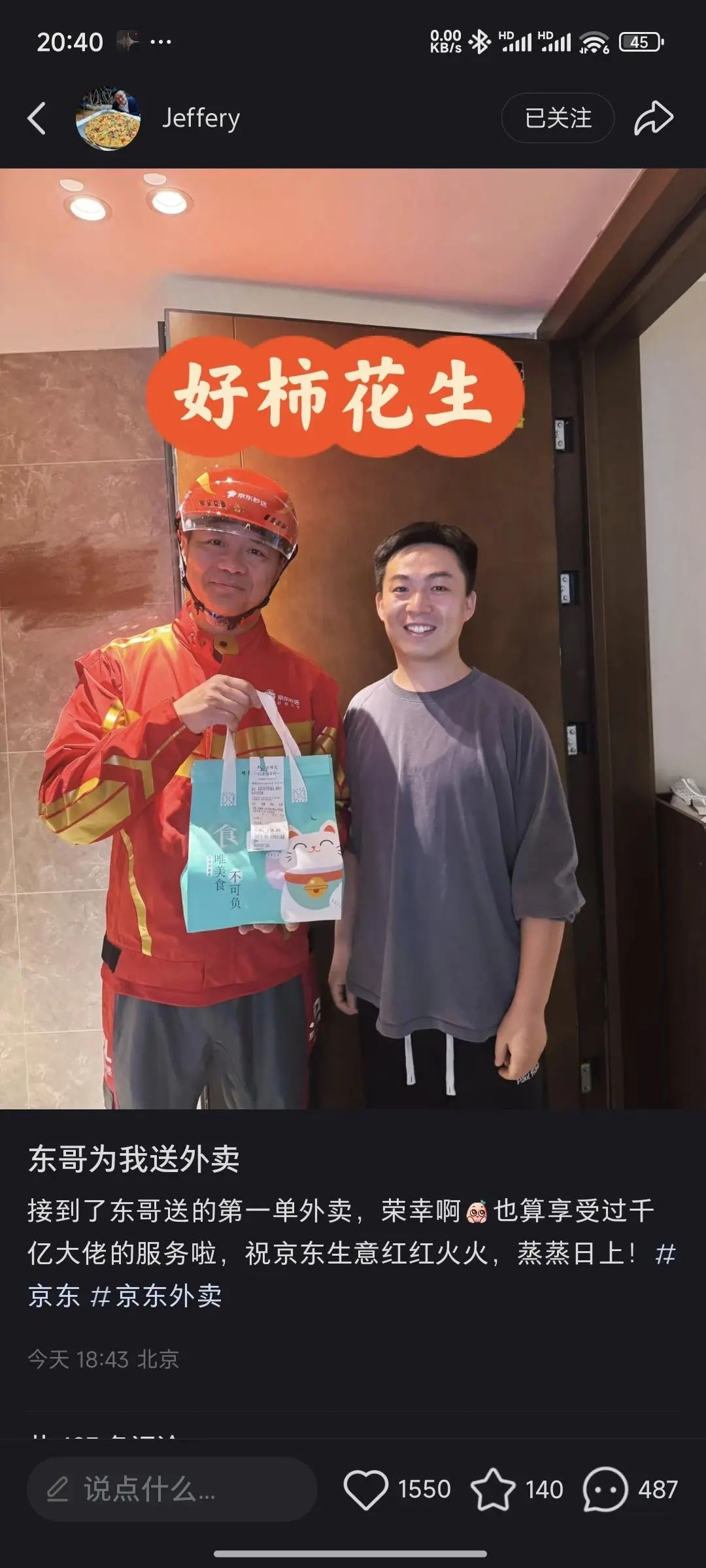 4月21日,有网友在小红书平台分享了一张刘强东亲自送外卖的照片,此举引发不少网友热议。