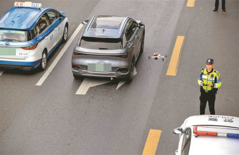 无人机在空中“喊话”开展交通劝导,实时对违法行为进行抓拍取证。 深圳特区报记者 赖犁 摄