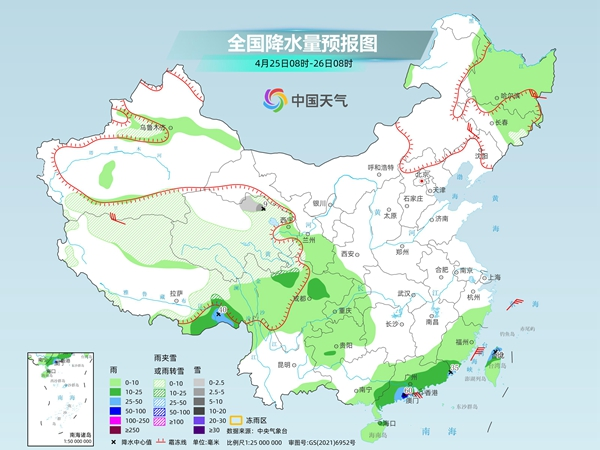 未来几天,南方还将持续多雨模式,其中今天强降雨的核心区域将集中在广东中北部、福建西南部和中北部等地。中央气象台预计,今天内蒙古东北部、黑龙江西北部、新疆沿天山地区、西藏北部、青海南部等地部分地区有小到中雪或雨夹雪,其中,内蒙古东北部、黑龙江西北部等地部分地区有大到暴雪。广东中北部、福建西南部和中北部、江西南部、浙江南部、西藏东南部等地部分地区有大到暴雨,福建中北部局地有大暴雨。