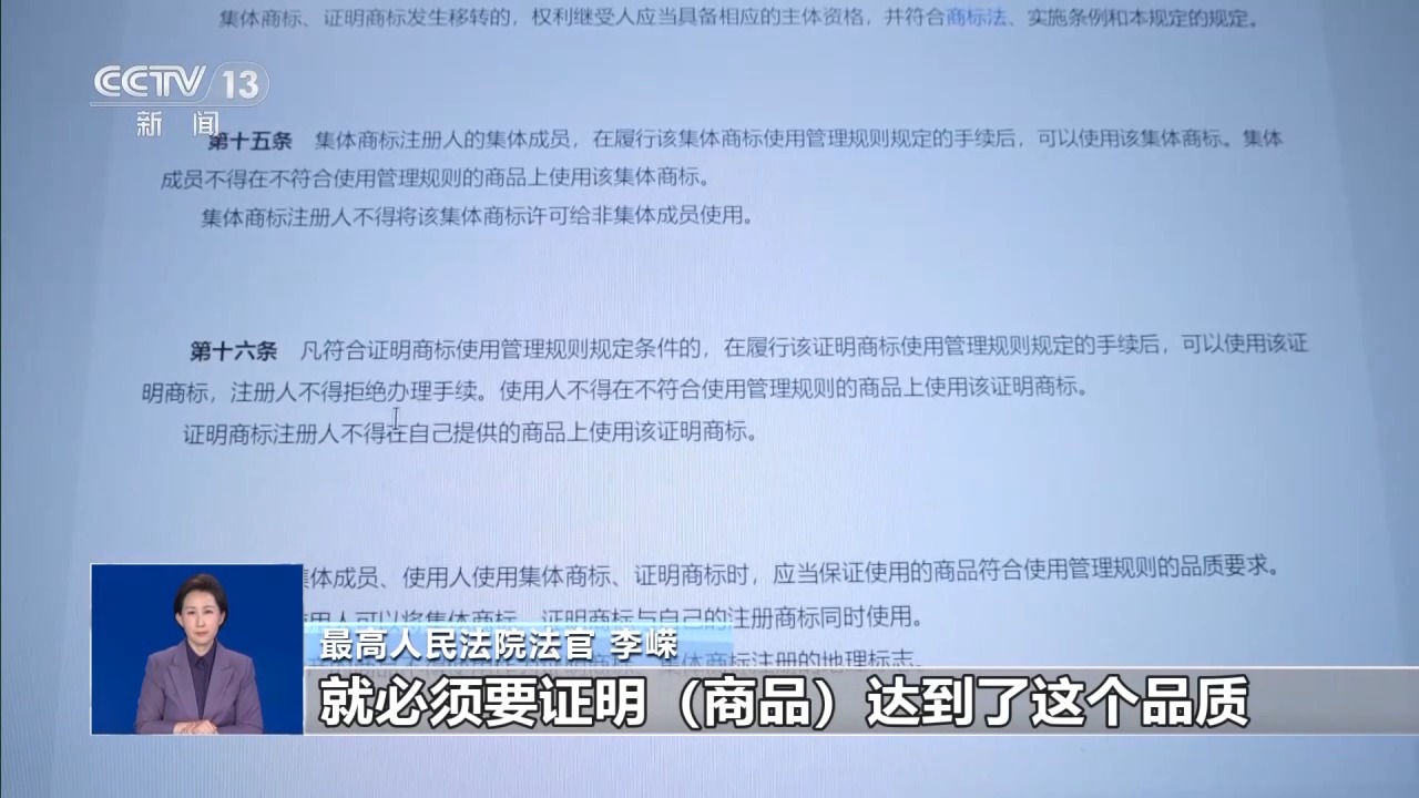 最高人民法院法官 李嵘:地理标志证明商标比地理标志集体商标,实际上规定了更为严格的条件,对特定品质有一个证明的作用。生产经营者要使用的话,就必须要证明商品达到了特定品质,而不仅仅只证明它的产地符合要求。