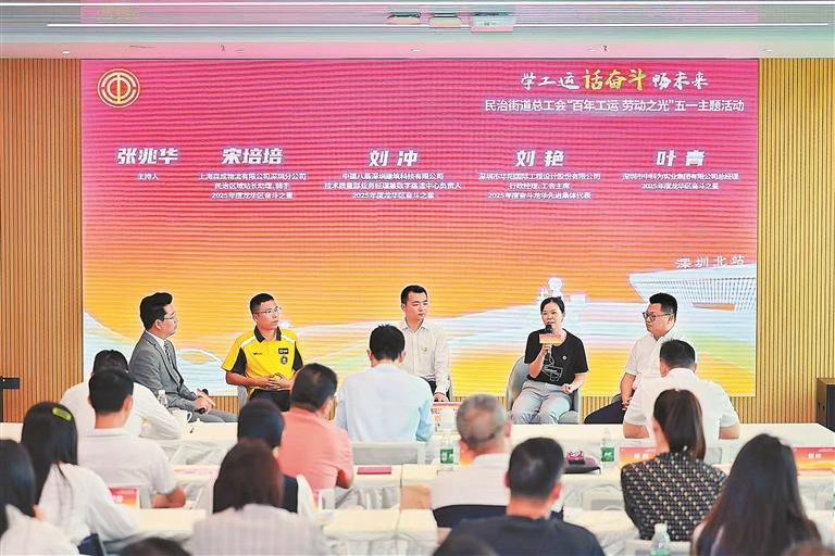 在对话奋斗者环节,活动特别邀请了2025年龙华区“奋斗之星”和先进集体代表进行访谈。美团站点站长助理宋培培分享了从骑手到管理者的成长历程;中建八局质量部业务经理兼中心负责人刘冲讲述了在建筑项目中攻坚克难的日日夜夜;华阳国际工程设计股份有限公司工会主席刘艳介绍了企业搬迁后的工会创新服务;中科为实业集团有限公司总经理叶青则分享了AI企服平台的研发理念与多角色平衡的心得。