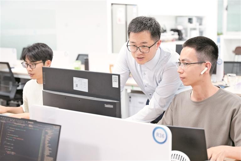 黄有为与同事进行技术交流。