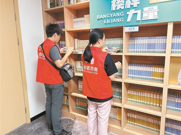 大岭社区青少年志愿者在社区党建书吧整理图书。