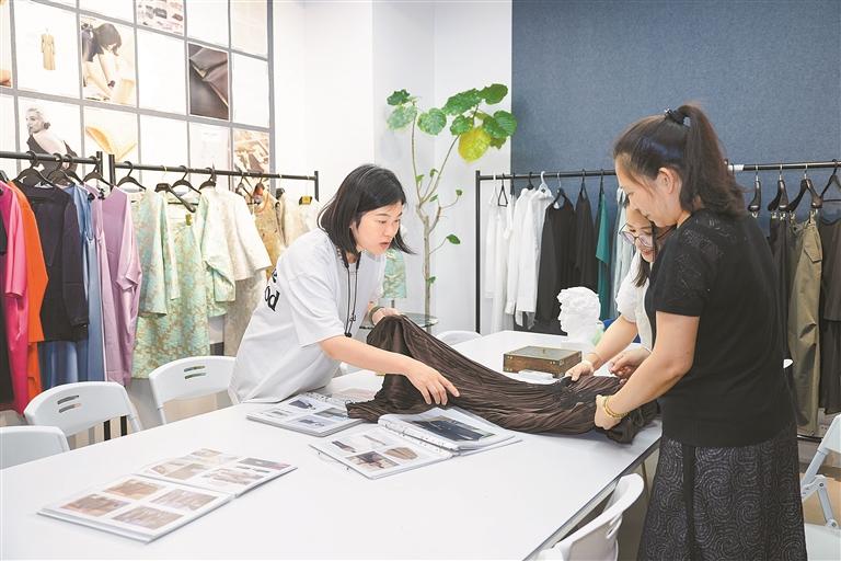 灵璐与同事讨论衣服成品。