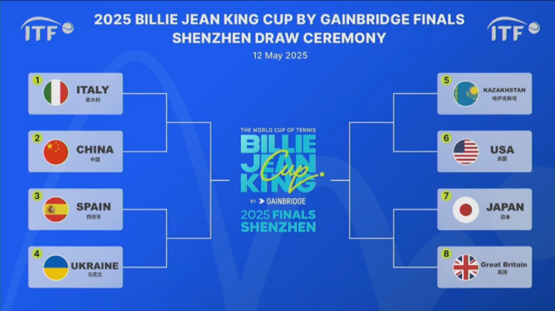 2025比利·简·金杯深圳总决赛八强阵容由卫冕冠军意大利队、东道主中国队与从资格赛突围的六支队伍组成。比赛形式为三场两胜——包括两场单打比赛和一场双打比赛,所有比赛均按照三盘两胜制决出胜负。抽签仪式结束后,现场进行了赛事招商介绍和赞助商签约仪式。