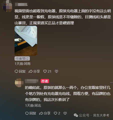 翟先生将这一经历发布到网上,并回复网友称,该手机充电线非原装。